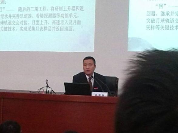 下午四时十分,孙泽洲准时出现在将军路校区一号楼四楼报告厅,此刻的报告厅一改往日的清净,走廊、过道,甚至在门口都挤满了前来听报告的同学们。在简单的介绍后,孙泽洲做了题为“嫦娥三号探测器与中国探月工程”的报告。