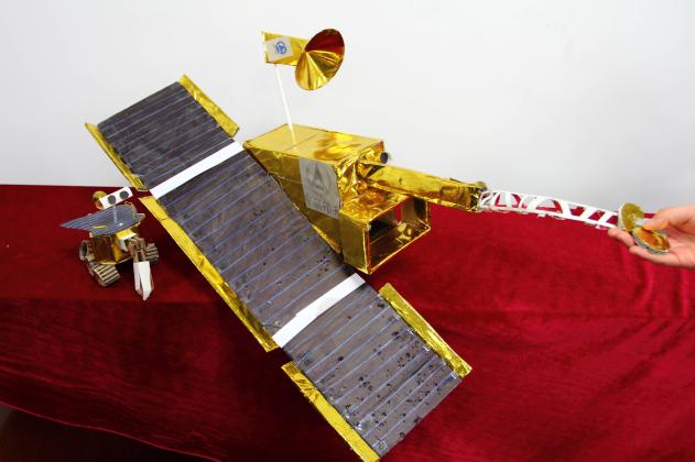 可伸缩信号塔、太阳能翻板、散热线路、摄像头、传感器、备用电池,“开拓者联盟”火星探测组合以一身“土豪金”亮相“航天DIY”决赛,并一举斩获“最佳特色奖”。来自探测制导与控制技术专业大一的施天宇是团队队长,据他介绍,“开拓者联盟”由绕火星运动的卫星和一个火星车组成,特色在于设备完善:卫星原本两块的太阳能电池板改为一块,可自由调整提高面积太阳能的利用率,翻板背面还装备了备用电池;火星车的可伸缩机械臂可采集岩石。“太阳能电池板是找文具店阿姨要的废纸板,竹签之类的都是废旧物品再利用。”施天宇说,所有的尺寸都是在纸板上事先规划好,然后再分工剪裁和组合的。