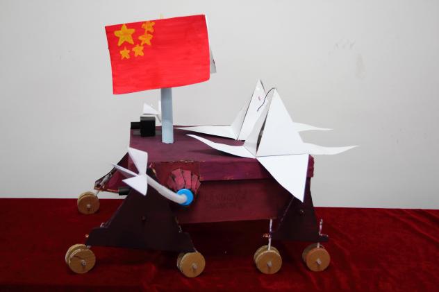 “朱一鸣捧着刚买鞋子的鞋盒,我们就知道咱们的火星车主体就有了。”“开采者一号”团队队长张琪笑着介绍,他们的“开采者一号”火星车主体是一个鞋盒。另外,火星车装有8个轮子,可上下浮动,可自由转向,方便在崎岖的火星表面自由穿梭;太阳能电池板塔可升降收缩,遇到风暴等恶劣天气可收缩“隐藏”起来,塔体本身作为环境信息的分析仪;更有可360度旋转的雷达和机械臂。“最难弄的轮子,为了让它能自由转向和上下浮动,我们想尽了办法,最后用小型环状荧光棒的连接体成功解决了。”队员朱一鸣说,“我们几个连续五天弄到凌晨两点,终于一点点地完善了它。”