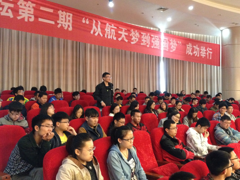 最后,闻新老师就“怎么放飞航天梦,实现强国梦”问题进行了阐述和分享。他认为,同学们首先应该努力加强理论和知识学习;同时要建立吃苦、创新和奉献的理念,才能在航天报国的道路上越走越远。
