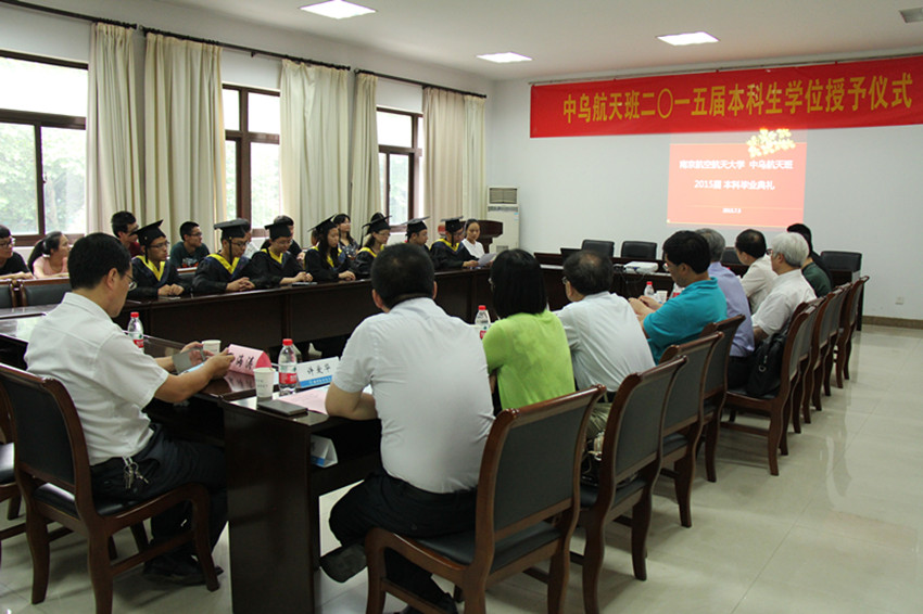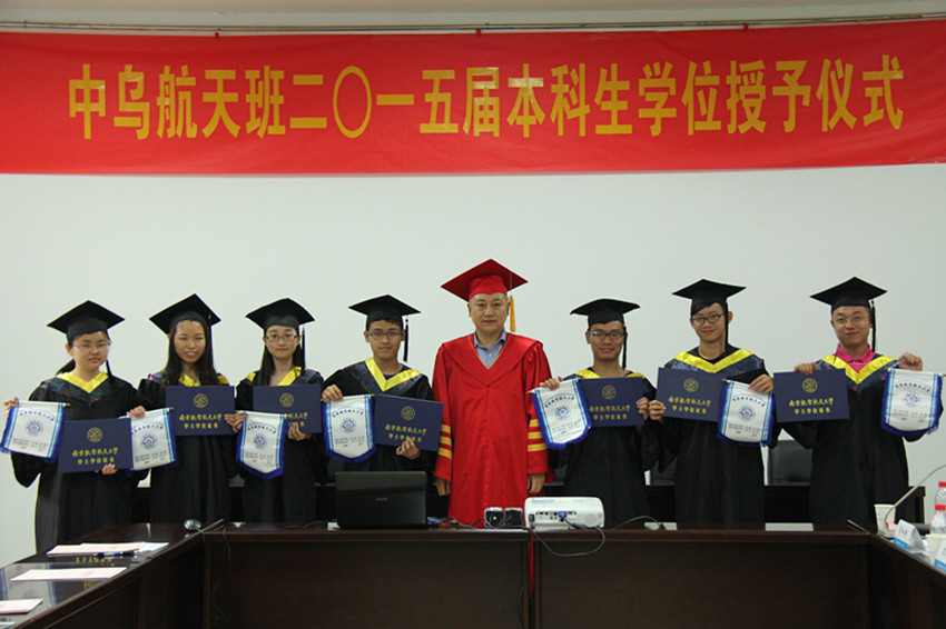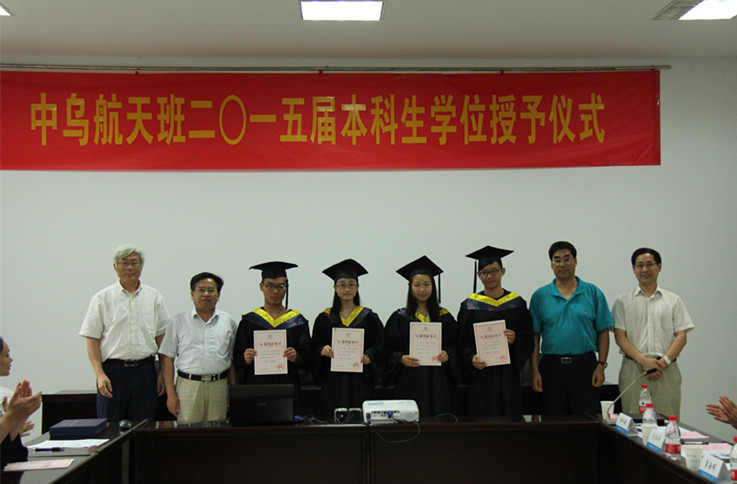 7月3日下午,我校中乌航天班2015届本科生毕业典礼暨学位授予仪式在明故宫校区A3-318会议室举行。学校教务处处长王成华、国际合作交流处处长金泉元、国际教育学院院长何宁、宣传部副部长孔令华、研究生院副院长王亚彤、学生处副处长许爱华等职能部门领导以及德赢vwin最新版下载院长陈卫东、党委书记季海群、副院长王海涛出席仪式,中乌航天班2015届毕业生以及2013级中乌航天班部分同学参加了仪式。仪式由德赢vwin最新版下载党委副书记李和新主持。