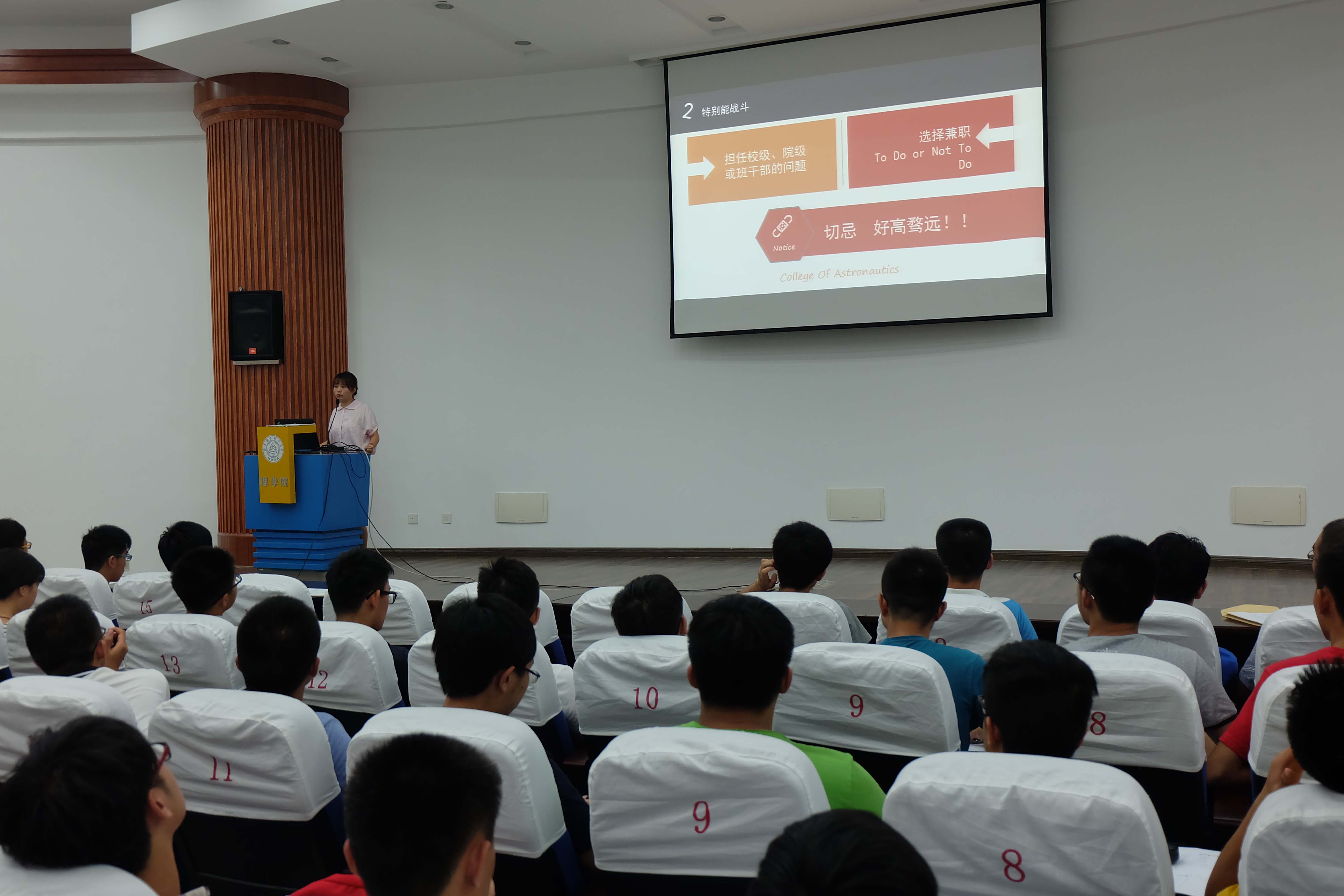 接下来辅导员从各个方面详细的为新生阐述了什么是“特别能吃苦,特别能攻关,特别能奉献,特别能战斗”的航天精神。辅导员刘洁告诉他们,在学习上,要特别能吃苦,要把学习看做生活的一部分,要多与别人交流,并且充分利用图书馆书籍。更重要的是,大学课堂不同于高中,一定要尽快适应大学的学习节奏。在学生工作上,要特别能战斗,特别能奉献,不好高骛远,更不要做组织里的“酱油党”,要认认真真,踏踏实实进步。在生活上,要特别能攻关。处理宿舍问题要做到相互尊重,真诚沟通。在管理自己的钱包时要注意节约,更要好好努力争取拿到奖学金。