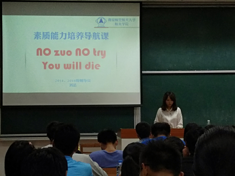 10月24号晚,德赢vwin最新版下载在将军路校区开展了第一次素质能力培养导航课。此次导航课由我院辅导员刘洁主讲,主题聚焦在“no zuo no try,you will die”,在场的德赢vwin最新版下载2015级全体大一新生一起聆听了课程。