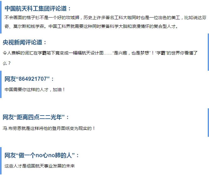 自从发现自己对飞行器设计的浓厚兴趣,丛天舒就开始了自主学习。不仅专门学习了素描,他还通过不断观摩他人制作的飞行器模型、大量阅读相关资料来扩充自己的知识库,而利用课余时间进行的设计图练习更是很少间断过。“ 从初二开始我就一直在不断画各种各样的飞行器,唯一一次长时间的中断练习是在高三的时候。现在我终于可以拿起画笔自由画出我构思的飞行器了,这感觉真是太棒了!”至于同学们对他的“刻苦”、“学霸”等评价,丛天舒笑着说:“我只是在做自己喜欢的事情,从来不觉得这件事有什么苦的。”因为决心坚持自己对航空航天飞行器设计的热情,丛天舒在填报高考志愿时无一例外都填写了与航空航天相关的专业。“这次绘制设计图也是兴趣使然,从前期一个多礼拜的准备,到持续两三天扑在设计图上,我也没觉得多辛苦,倒是有一种成就感,这是我至今为止画过的最完整、最细致的一系列设计图。”