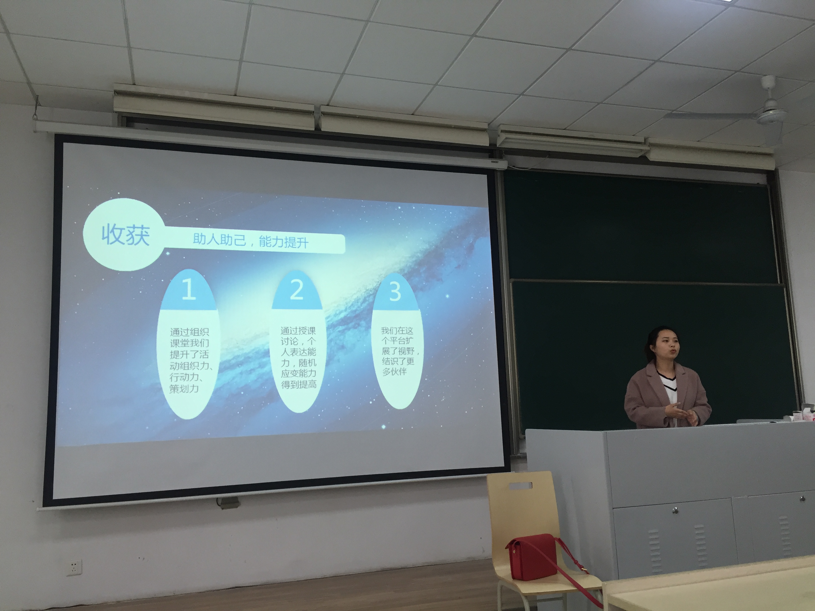 首先上台的“航天那些事”负责人席康。她介绍说, “航天那些事”航天小报经过一年的发展,形成了“航天大事件”、“航天漫漫看”、“航天焦点谈”三个较为成熟的模块,并荣获了校级志愿服务项目优秀团队的称号。接下来上台为大家分享的是“A.S学习空间”的负责人张文豪。一年走来,学习空间已经办了很多期,影响力也在不断扩大,参加“A.S空间”学习的同学成绩有了整体提升。下一个进行分享的是14级的王强同学,他为大家介绍北斗计划的优秀经验。他在活动中发生了无数感人的事,因为有认真负责的“领航星”,北斗领航活动受到了来自老师和同学的一致好评。