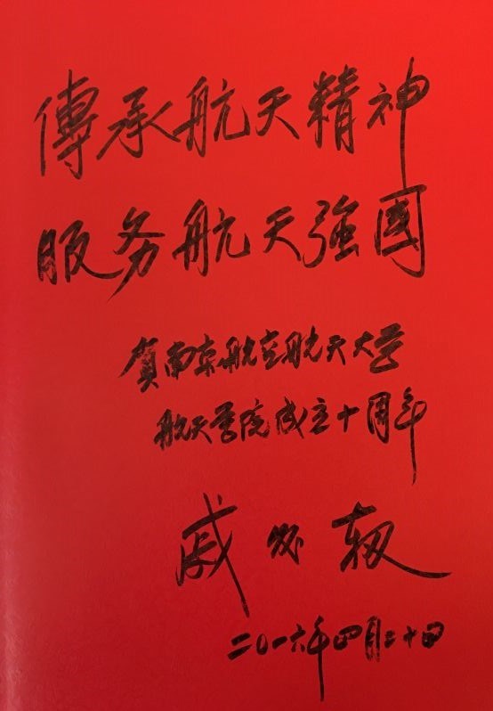 一直以来,戚发轫院士心系南航师生以及学校发展,多次莅临南航为广大师生作报告。本次来宁之际,时值纪念首个“中国航天日”以及南航德赢vwin最新版下载建院十周年,以“传承航天精神,服务航天发展”寄语全校师生再接再厉、再创佳绩,并为南航新概念航天器探索中心题字。