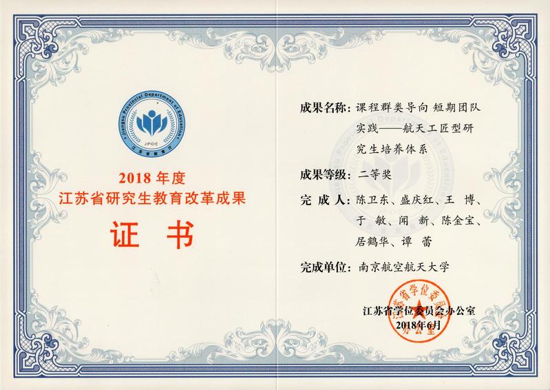 根据《省教育厅办公室关于做好2018年江苏省研究生培养创新工程项目申报工作的通知》(苏教办研函﹝2018﹞3号),在自愿申报、单位推荐的基础上,经专家材料评审、复评答辩评审、社会公示、省教育厅审定,确定了24项成果作为2018年江苏省研究生教育改革获奖成果。其中,我院陈卫东、盛庆红、王博等老师完成的研究生培养体系改革《课程群类导向短期团队实践——航天工匠型研究生培养体系》荣获二等奖。